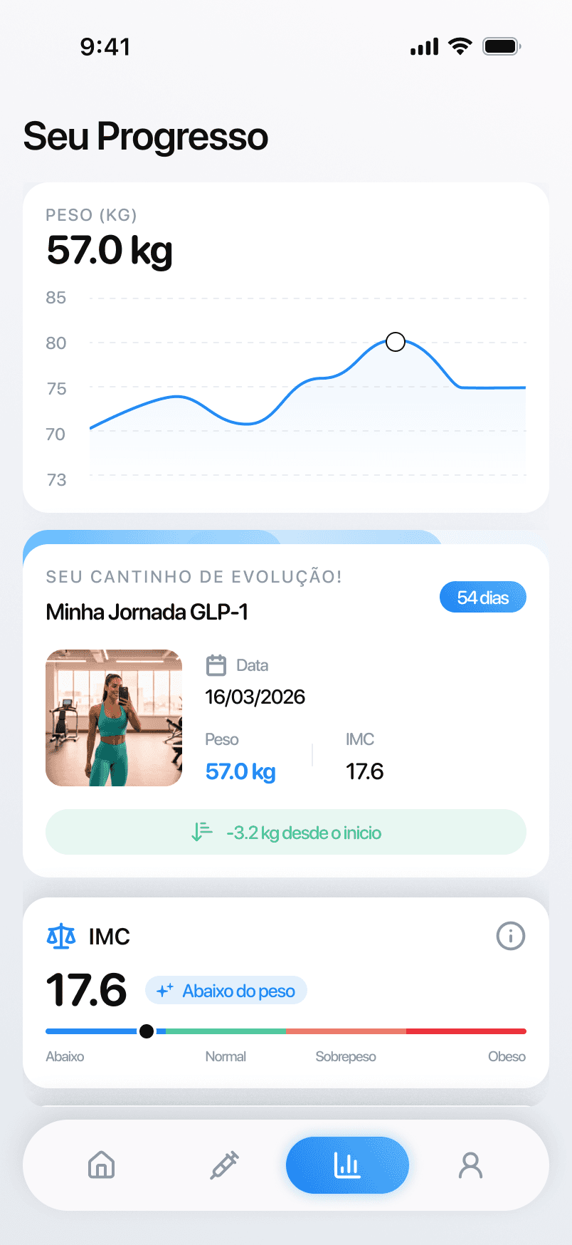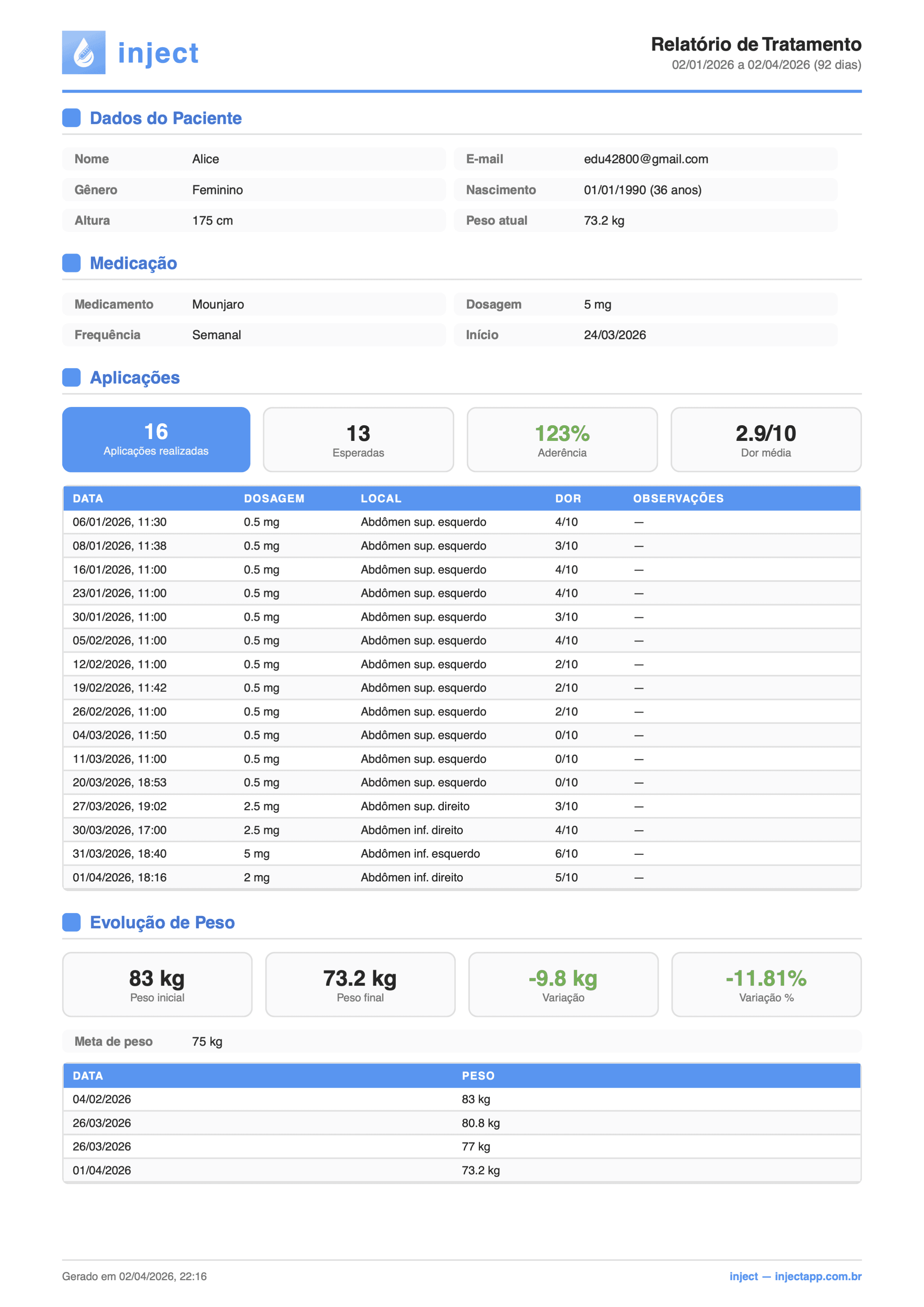 Com Inject, você tem o relatório completo dos seus pacientes com aplicações, treinos, fotos e evolução de peso, informação de nutrição e muito mais.
